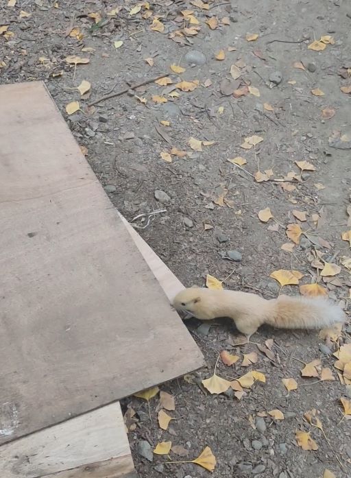 在沿著圖書館那邊的樹林散步時偶然發(fā)現(xiàn)一只松鼠抱著木板啃: