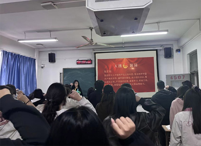本次活動以“使命傳承+專業(yè)踐行”雙翼并行,構(gòu)建起兼具思想深度與實踐價值的育人場景。在使命傳承·儀式教育環(huán)節(jié),全體團員身著整齊服裝,肅立齊唱《中國共產(chǎn)主義青年團團歌》,激昂的旋律凝聚起青春奮進的力量。面向鮮紅的團旗,團員們高舉右拳,重溫入團誓詞,“我志愿加入中國共產(chǎn)主義青年團……”鏗鏘誓言回蕩在活動現(xiàn)場,既是對入團初心的回望,更是對青年責任的莊嚴承諾,進一步強化了團員們的組織歸屬感與時代使命感。