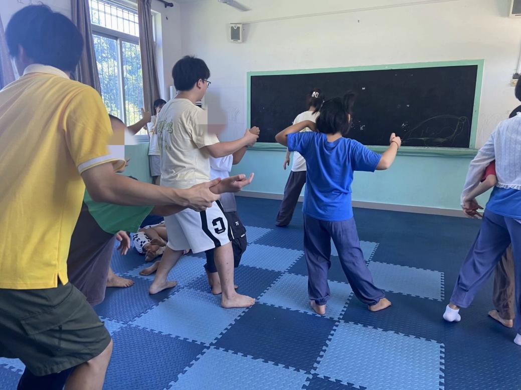 圖4 志愿者帶領(lǐng)孩子們做太極拳孩子們集中注意力,在每個招式間提升自主意識,通過呼吸與動作的協(xié)調(diào),逐漸打開封閉的心門,感受來自外界的聲音。在志愿者們的耐心指導(dǎo)下,每一個轉(zhuǎn)身、每一次推手,見證了孩子們的進步。