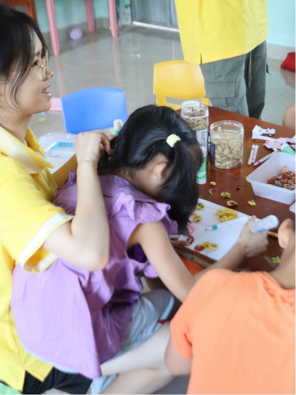 圖2 志愿者與孩子們一起制作中藥貼畫明目潤腸的決明子、美容養(yǎng)顏的玫瑰、補血活血的當(dāng)歸,每一種草藥都有其獨特的療效和作用,它們被孩子們的巧手粘貼在紙上。這個過程不僅激發(fā)了孩子們的創(chuàng)造力和想象力,更讓他們在接觸自然、了解中藥文化的同時,感受到來自大自然的氣息。