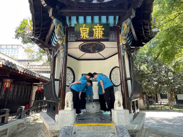 實(shí)踐團(tuán)成員懷揣崇敬與求知之心,深入探訪包公故居的歷史印記。從寓意“清泉鑒心”的廉泉井,到鐫刻著“后世子孫仕宦,有犯贓濫者,不得放歸本家”鐵律的《包拯家訓(xùn)》碑;從莊嚴(yán)肅穆的孝肅閣,到象征包拯剛正不阿品格的戒貪壁雕,學(xué)子們駐足凝視,細(xì)心研讀。在包拯塑像前,成員們誦讀其“清心為治本,直道是身謀”的詩(shī)句,沉浸式體悟其“鐵面無(wú)私、清廉如水”的為官之道。故居內(nèi)的一磚一瓦、一匾一聯(lián),無(wú)聲訴說(shuō)著這位北宋名臣“拒禮為開(kāi)廉潔風(fēng)”的浩然正氣。成員們特別聚焦學(xué)習(xí)了包拯“不持一硯歸”的廉潔典故,對(duì)其身體力行的嚴(yán)于律己有了更深刻的認(rèn)識(shí)。