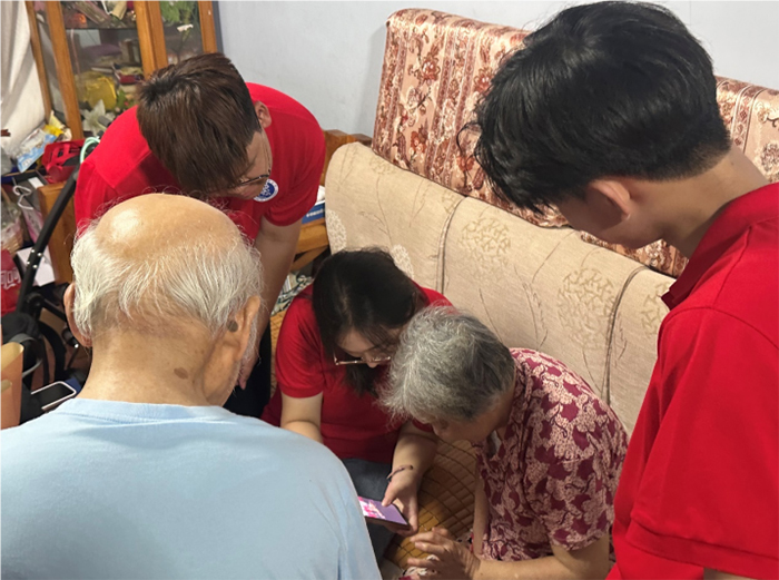 上圖為團隊成員幫助爺爺奶奶查看手機的問題。(王夢泓 供圖)