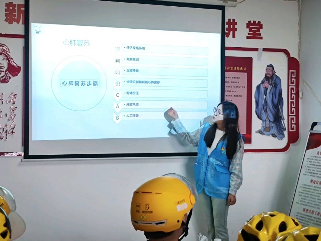 本次培訓(xùn)活動分為理論講解與自主實踐兩部分。團(tuán)隊成員通過精心制作的ppt向參與者深入講解了心肺復(fù)蘇、海姆立克急救法及中暑急救方法,并現(xiàn)場演示心肺復(fù)蘇流程,從初步判斷意識狀態(tài)到迅速啟動緊急響應(yīng)系統(tǒng),再到細(xì)致檢查并開放氣道、實施人工呼吸及精準(zhǔn)的胸外按壓,每一步都操作規(guī)范、講解詳盡,確保每位參與者都能清晰理解并準(zhǔn)確掌握。