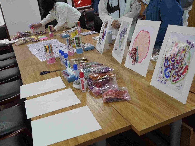 花藝工坊和心靈畫布兩個活動大受歡迎,大朋友們和小朋友們沉浸在自由創(chuàng)作的快樂里,攤位的長桌前圍滿了人,連投影儀前的桌椅都被我們“征用”。