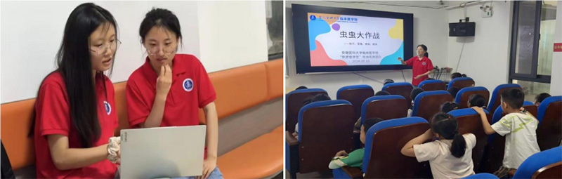 下午志愿隊(duì)針對(duì)兒童進(jìn)行了寄生蟲(chóng)科普小課堂,志愿隊(duì)員以獨(dú)特的卡通動(dòng)畫(huà)的方式向兒童展示了常見(jiàn)寄生蟲(chóng)的感染方式以及對(duì)人體的危害,課堂上志愿隊(duì)積極的與兒童們進(jìn)行互動(dòng),帶動(dòng)兒童對(duì)寄生蟲(chóng)相關(guān)知識(shí)的積極性,促進(jìn)兒童健康成長(zhǎng)。