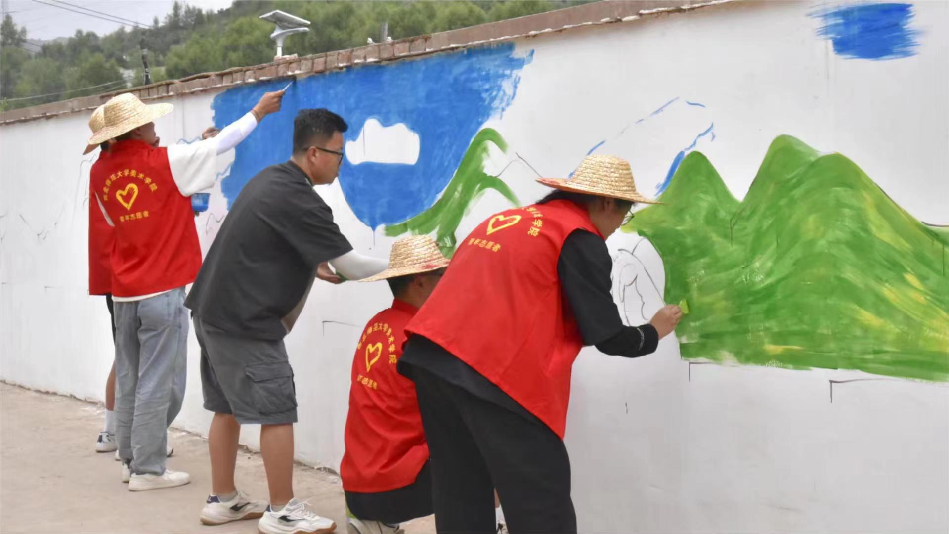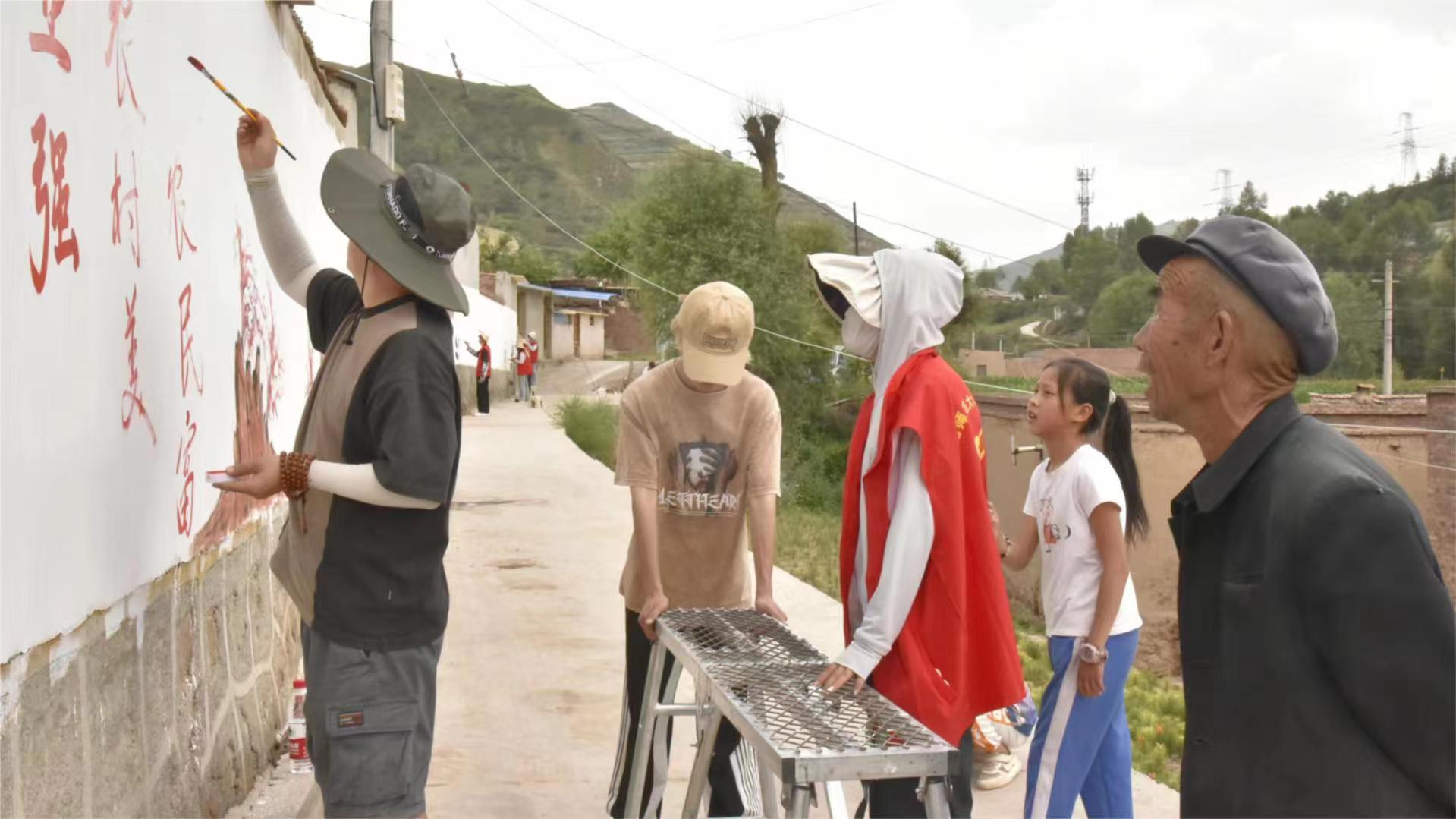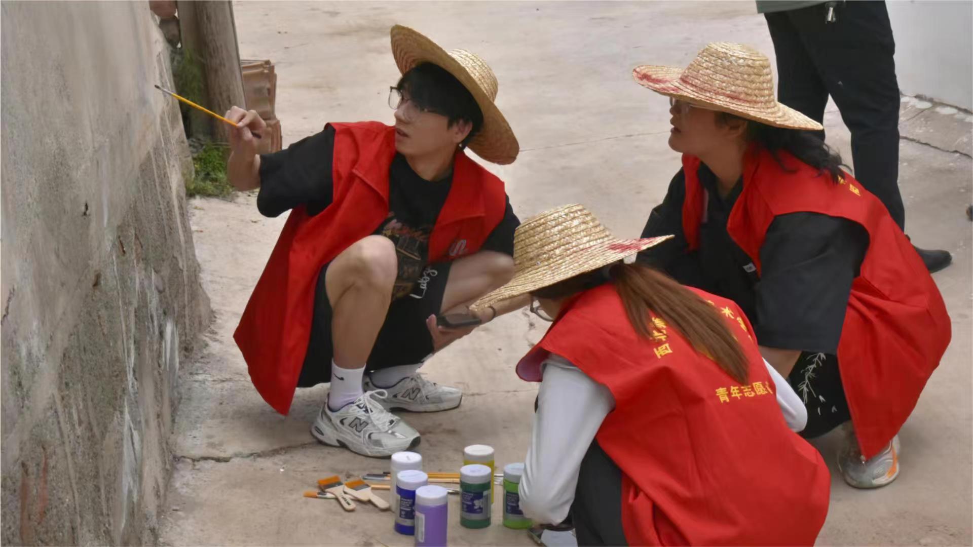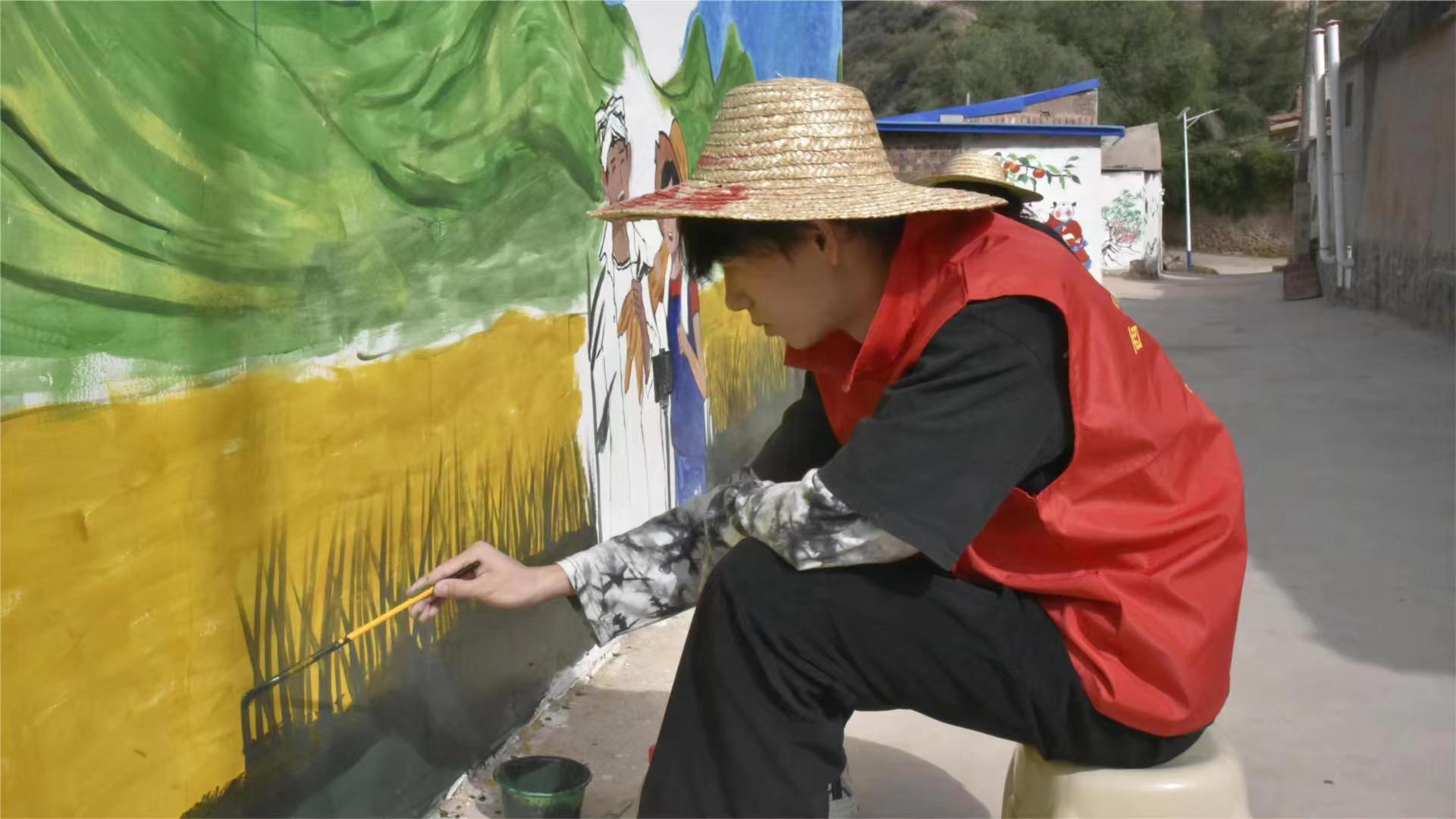 圖為實(shí)踐團(tuán)隊(duì)員在進(jìn)行關(guān)于黨政宣傳的墻面繪制。(拍攝者:陳洋洋)