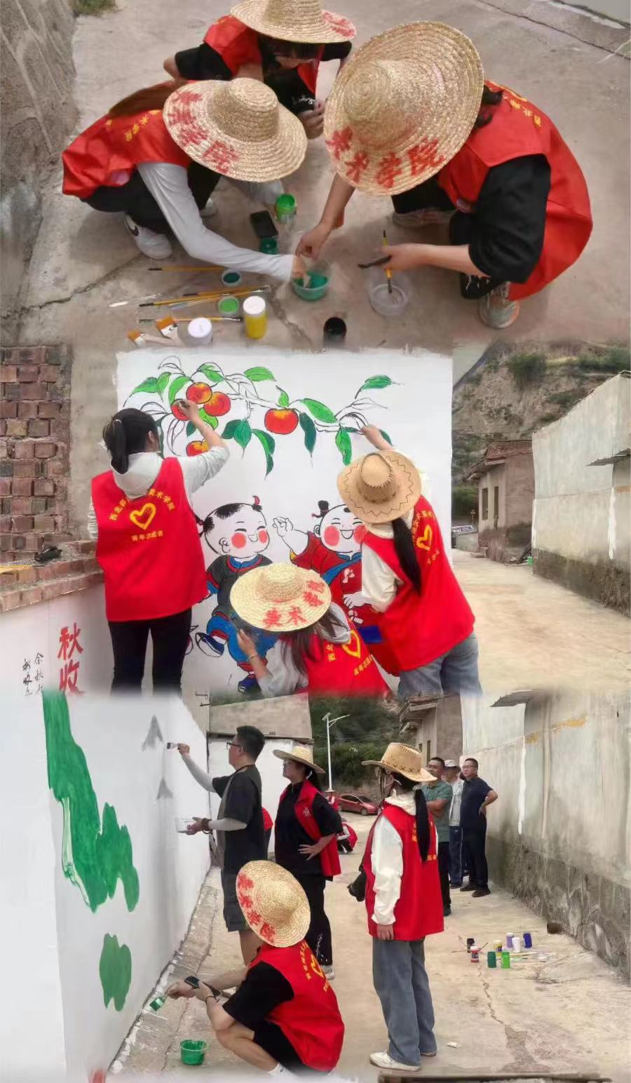 在紅光村和南堡村,美術(shù)學(xué)院學(xué)子充分發(fā)揮個(gè)人專業(yè)優(yōu)勢(shì),以白色墻壁為畫布,緊扣時(shí)代主旋律、結(jié)合本土特色,以藝術(shù)畫筆為語(yǔ)言,以“鄉(xiāng)村振興”“鄉(xiāng)村旅游”“社會(huì)主義核心價(jià)值觀”“黨史學(xué)習(xí)教育”為主題,共繪制墻面30余面、400余平方米,墻繪內(nèi)容豐富多樣,有的展現(xiàn)了當(dāng)?shù)氐淖匀伙L(fēng)光、民俗民風(fēng),如金黃的稻田、古老的建筑等;有的描繪了鄉(xiāng)村生活的溫馨場(chǎng)景,如村民們豐收的喜悅、兒童們的嬉戲玩耍;有的傳遞了積極向上的價(jià)值觀,如愛國(guó)敬業(yè)、團(tuán)結(jié)友愛等。