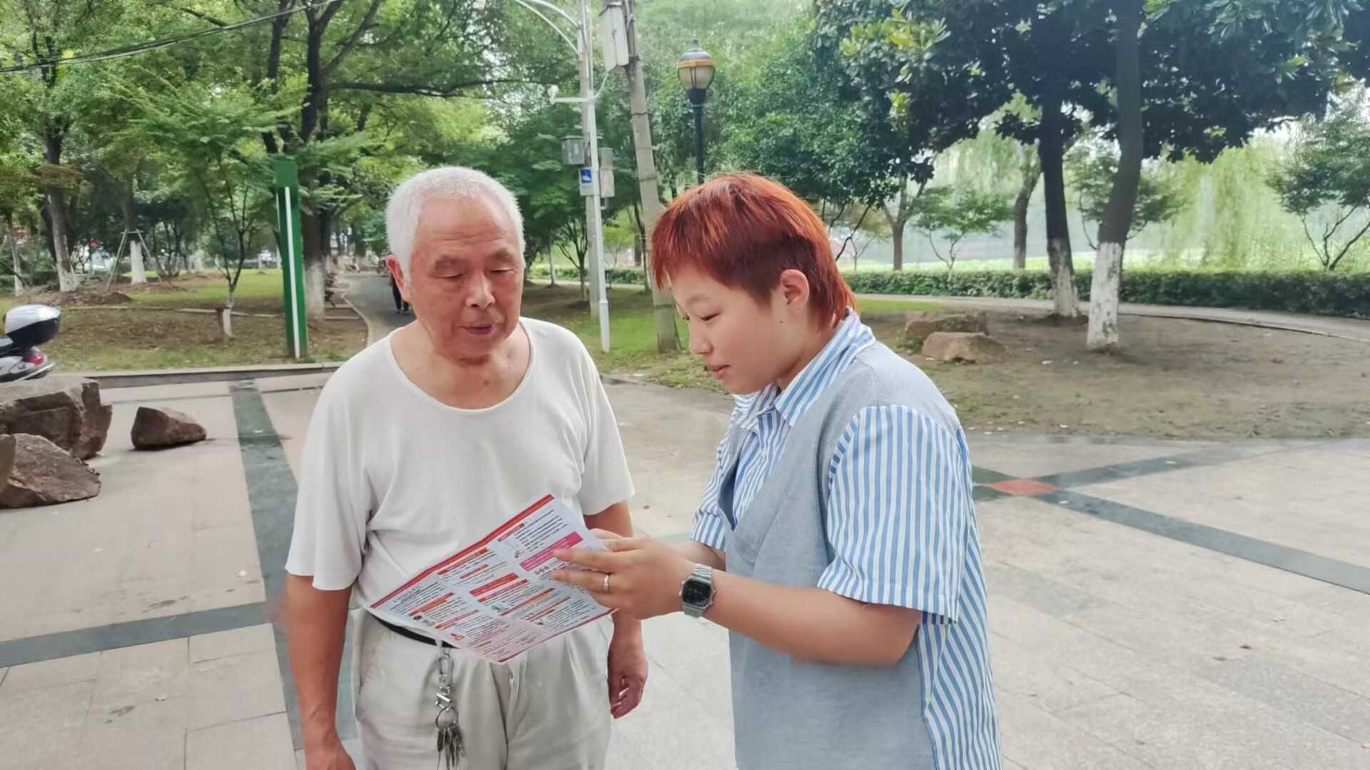 (圖為普法宣講團(tuán)成員發(fā)放傳單并與居民互動(dòng)照片。通訊員 徐佳 供圖)