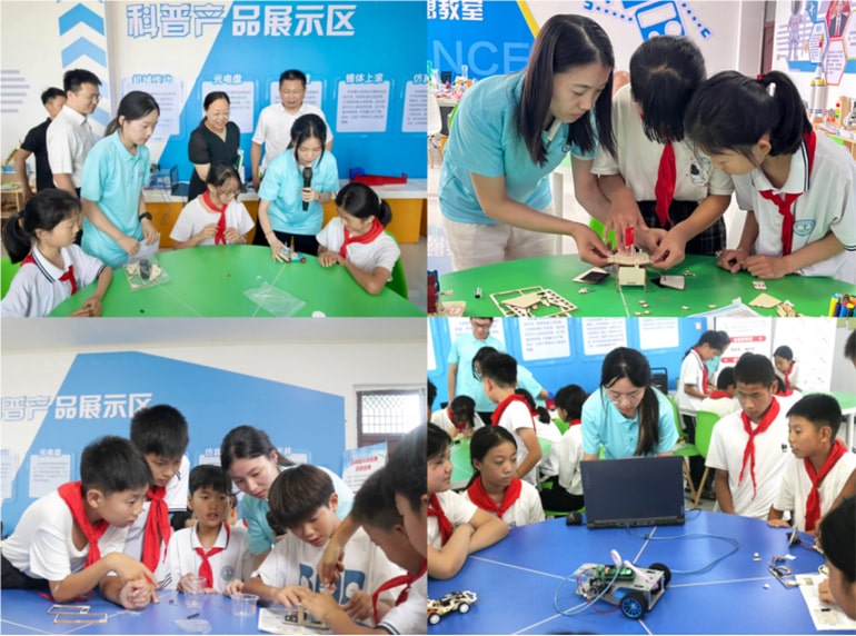 儀式后,計算機工程學(xué)院“指尖智薈”科技志愿服務(wù)團成員在太平實驗學(xué)校面向?qū)W校五、六年級三十余名學(xué)生開展了為期三天的科普課堂實踐活動;顒舆^程中,團隊成員們充分發(fā)揮專業(yè)優(yōu)勢,精心準(zhǔn)備,認(rèn)真?zhèn)湔n,向?qū)W生們生動講解和展示了包括“鹽水發(fā)電”、“花茶變色”、“飲水鳥”、“智能小車”、“時代的浪潮-人工智能”、“溫控風(fēng)扇”、“輝光球”、“光學(xué)系列實驗”、“磁的奧秘”、“科學(xué)家精神”、“航天精神”等近20個富有趣味性的科學(xué)小實驗和科學(xué)理論宣講課程,并且聯(lián)系實際,用淺顯易懂的方式幫助學(xué)生們了解和掌握實驗背后蘊含的熱力學(xué)、鏡面反射、AI等科學(xué)知識。整個過程課堂氣氛熱烈活躍,學(xué)生們聚精會神,積極參與。成員們也積極指導(dǎo)學(xué)生們實際動手操作體驗科學(xué)小實驗,從原理、實驗過程等各個角度充分為學(xué)生解疑答惑,引導(dǎo)學(xué)生在“做”中學(xué),充分感受科學(xué)魅力,激發(fā)學(xué)生熱愛科學(xué)、參與科普的熱情和興趣。