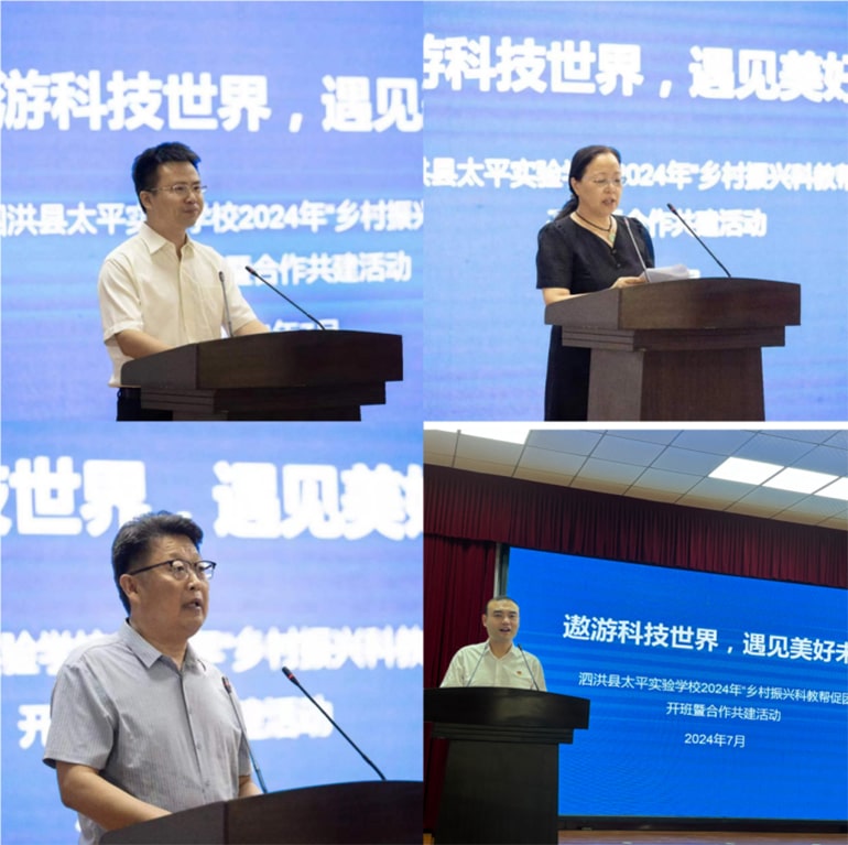 7月12日,共建大學(xué)生社會實踐基地簽約揭牌儀式在太平實驗學(xué)校報告廳順利舉行,儀式由南京工程學(xué)院駐泗洪鄉(xiāng)村振興工作隊隊員、計算機工程學(xué)院分團委書記孫大尉主持。儀式上,泗洪縣縣委副書記、省委駐泗洪縣鄉(xiāng)村振興工作隊隊長耿立昂發(fā)表致辭,對不辭辛苦來到太平實驗學(xué)校進行鄉(xiāng)村振興科教幫促、以實際行動助推鄉(xiāng)村教育振興工作的計算機工程學(xué)院師生一行表示肯定。泗洪縣教師發(fā)展中心副主任許璟發(fā)表講話,感謝南京工程學(xué)院計算機工程學(xué)院的大力支持,并對兩校合作建立社會實踐基地表示充滿期待。劉艷華副書記簡要介紹了學(xué)校和學(xué)院的專業(yè)設(shè)置和人才培養(yǎng)等基本情況,鼓勵學(xué)院本次參加科普課堂實踐活動的同學(xué),主動將社會實踐融入到鄉(xiāng)村振興戰(zhàn)略大局中,發(fā)揚敢于吃苦、不怕困難的精神,發(fā)揮自身專業(yè)優(yōu)勢,腳踏實地,在實踐中磨練意志、增長才干,以實際行動為學(xué)校學(xué)院增添光彩。學(xué)院“指尖智薈”科技志愿服務(wù)團學(xué)生代表楊星怡上臺發(fā)言,并向與會領(lǐng)導(dǎo)鄭重承諾在為期三天的科普課堂實踐活動中,會努力克服各種挑戰(zhàn),圓滿完成本次實踐活動。