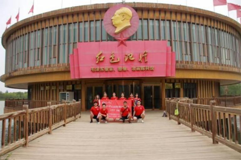 (圖為實(shí)踐團(tuán)在紅色記憶毛澤東像章館合影留念/張倩倩、李梅梅 攝)