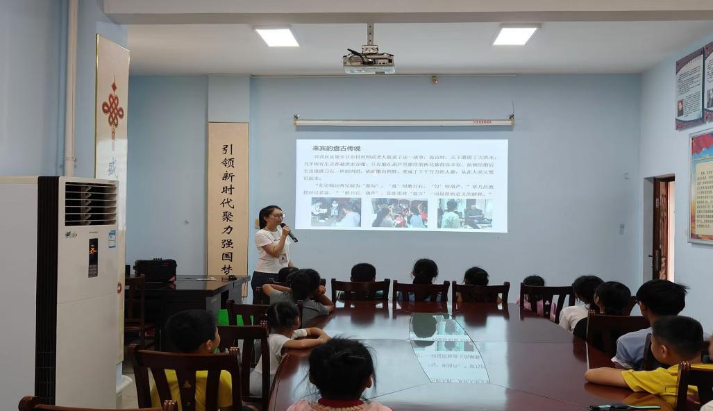最后,29日,成員們在南寧市展開了一場宣講活動。青年是一個民族的未來與希望,更是文化傳承的主力軍。在宣講活動中,成員們通過PPT播放的形式,從神話傳說、載體簡介、前景傳承等主題入手,給當(dāng)?shù)氐男∨笥褞砹艘惶蒙鷦佑腥さ奈幕R普及課。課上,小朋友們從一開始的困惑到后來的積極提問,也讓成員們看到了盤古文化傳承的美好前景。