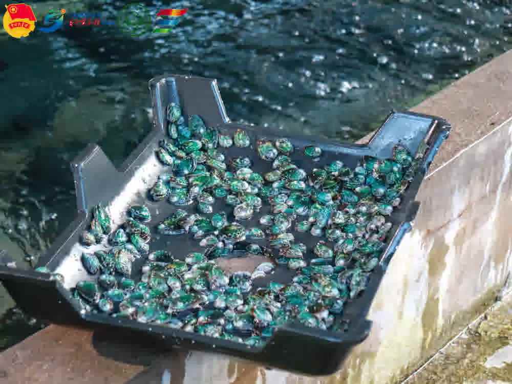 為了讓隊(duì)員們有更直觀的體驗(yàn),吳叔使用工具打撈出池內(nèi)的鮑魚進(jìn)行展示?粗活w顆鮑魚聚集吸附在幼苗專用板上,翡翠般光澤的外殼仿佛組成一張美麗的古董壁畫。隊(duì)員趁其不備抓起一只放至手心,活潑的跖面迅速帶動(dòng)身體蠕動(dòng),展現(xiàn)出其鮮活的生命力。