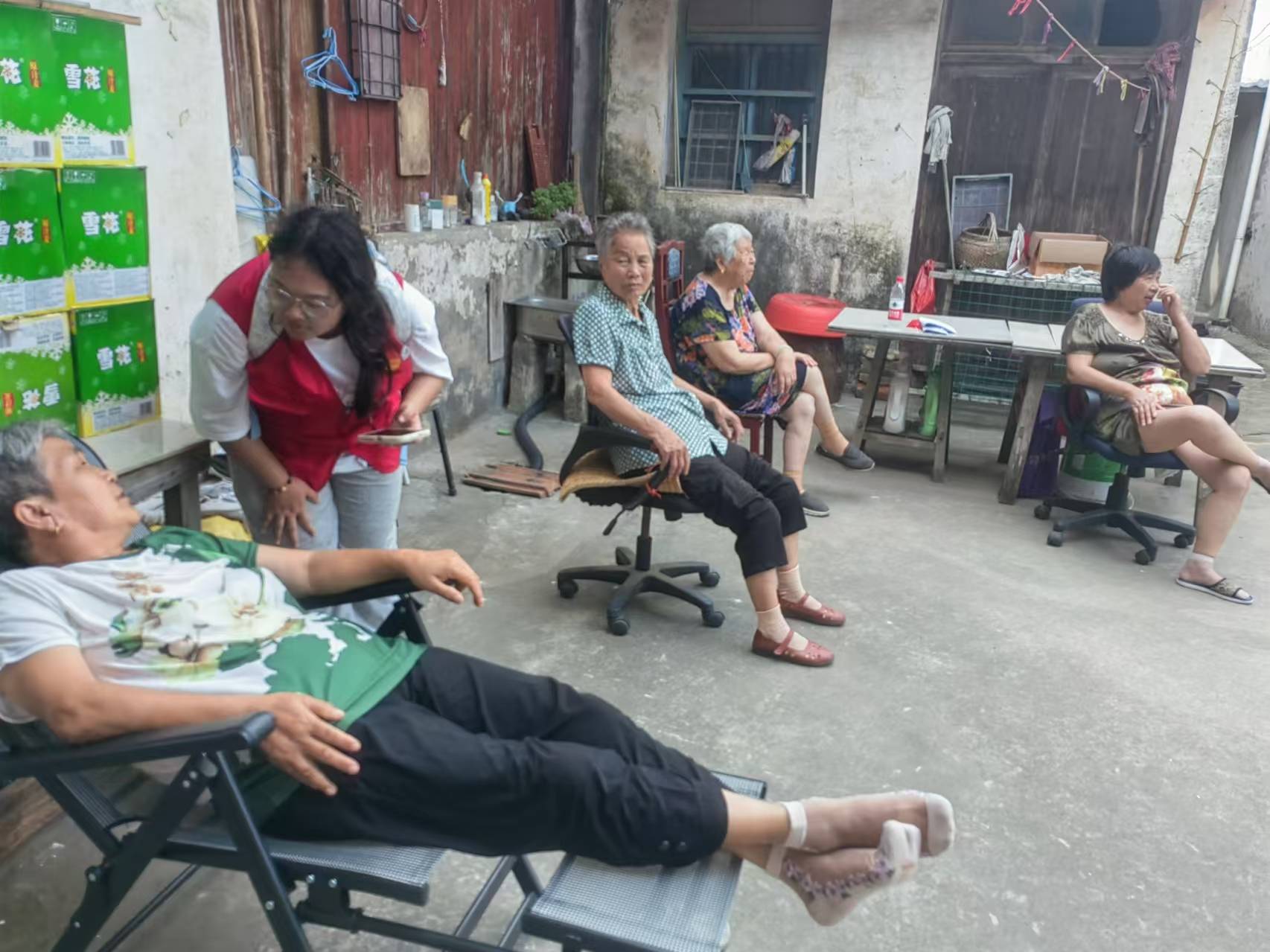 圖為海洋筑巢小隊正在笑著與買菜的奶奶交談。林奇奇攝