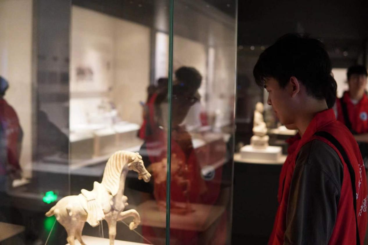 圖為實(shí)踐隊(duì)員觀看唐舞馬陶俑形態(tài)的畫面,通訊員 覃德潔 攝
