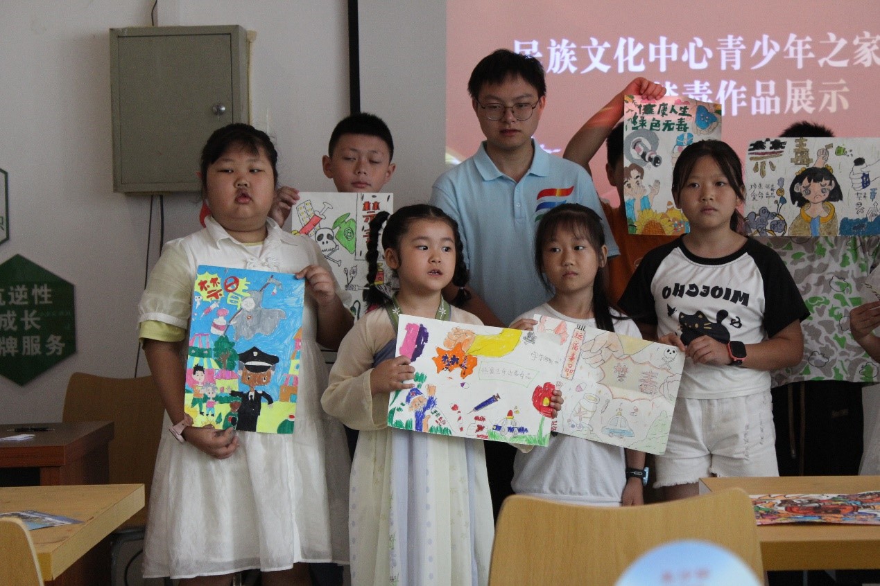 圖為青年之家小朋友們展示自己的禁毒主題繪畫(huà)作品 但欣玥 供圖