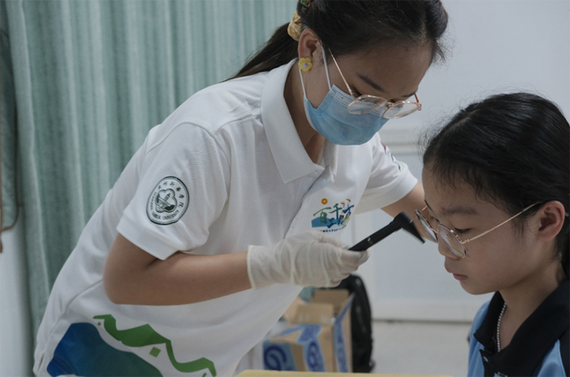 。▽(shí)踐隊(duì)隊(duì)員為學(xué)生們進(jìn)行視力、聽力篩查)