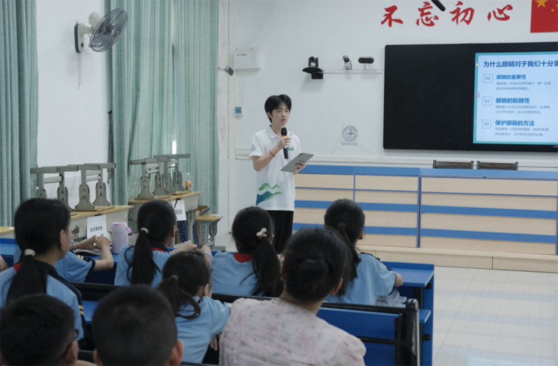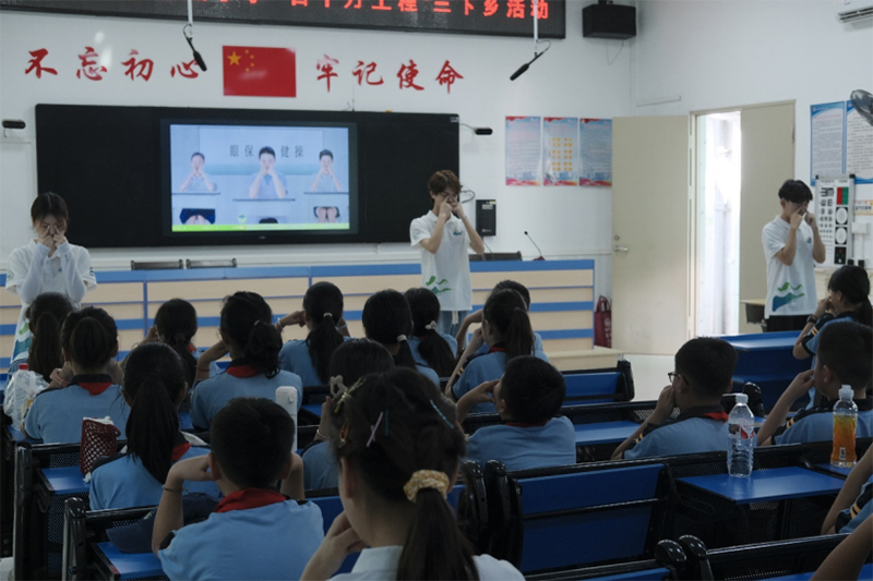 。▽(shí)踐隊(duì)隊(duì)員為學(xué)生開展視力、聽力知識(shí)宣講)