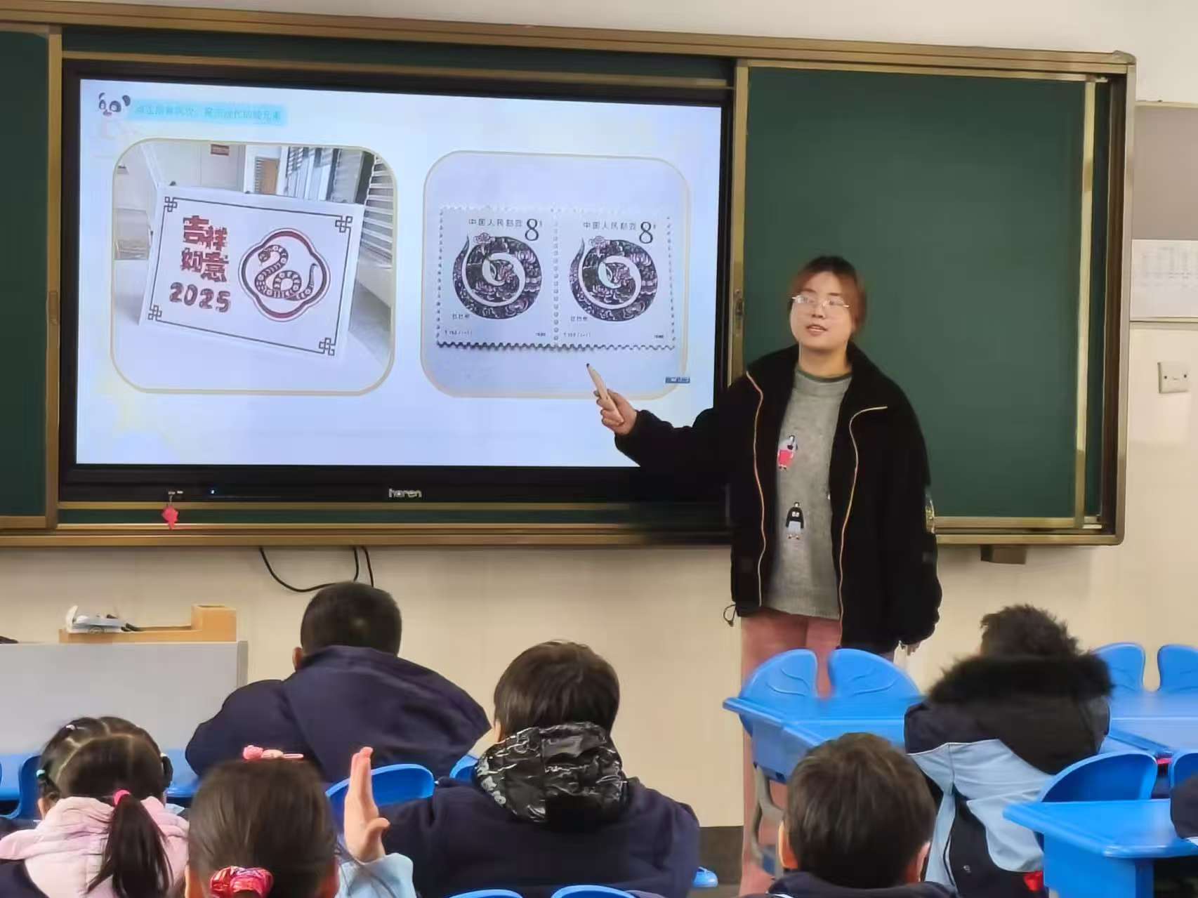 接下來,志愿者展示了蛇元素在古今的不同呈現(xiàn)形式。在古代,蛇元素有著豐富的文化寓意,是部落敬畏的圖騰,象征著守護;是青銅器上記錄歷史的紋飾;也是傳統(tǒng)服飾上體現(xiàn)古人審美的刺繡。通過圖片展示這些歷史畫面時,孩子們眼中滿是驚嘆。為幫助孩子們理解,志愿者播放了蛇四肢演變的動畫,還展示了現(xiàn)代生活中多樣的蛇元素,如可愛的蛇形玩偶、創(chuàng)意窗花等,讓孩子們感受到傳統(tǒng)文化的傳承與發(fā)展。
