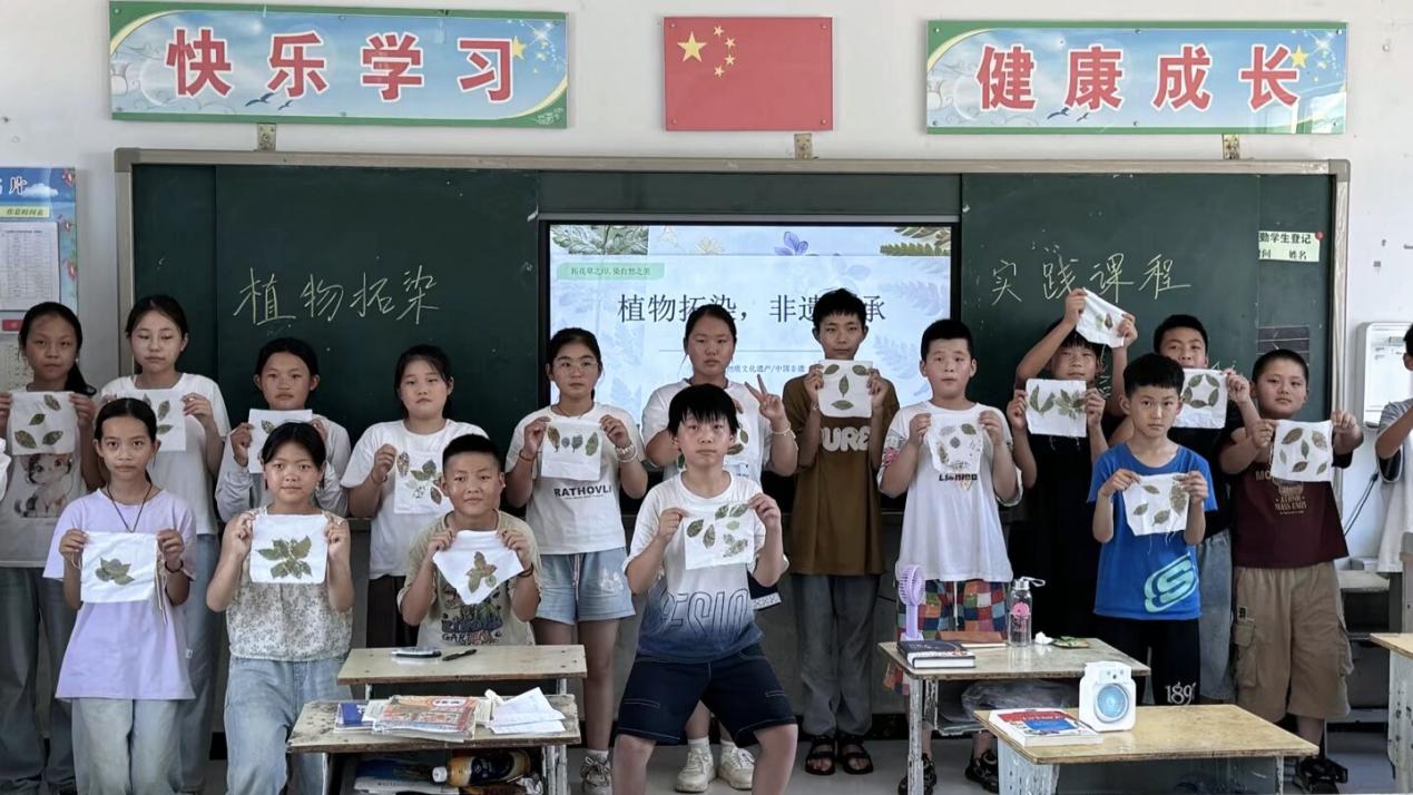 午后 14 時 30 分,留守校園的隊伍在手工植物拓染課堂中開啟自然與藝術的對話。隊員們帶領學生采集葉片花瓣,從植物形態(tài)觀察到圖案構圖設計,再到拓染技法實操,完整呈現(xiàn)傳統(tǒng)工藝的創(chuàng)作脈絡。孩子們在捶打葉片的沙沙聲中,將自然紋理轉(zhuǎn)化為獨一無二的布藝紋樣,既研習了非遺技藝的精髓,又在創(chuàng)意表達中感知自然美學的生命力,作品里躍動著草木清香與童真想象的交融之美。