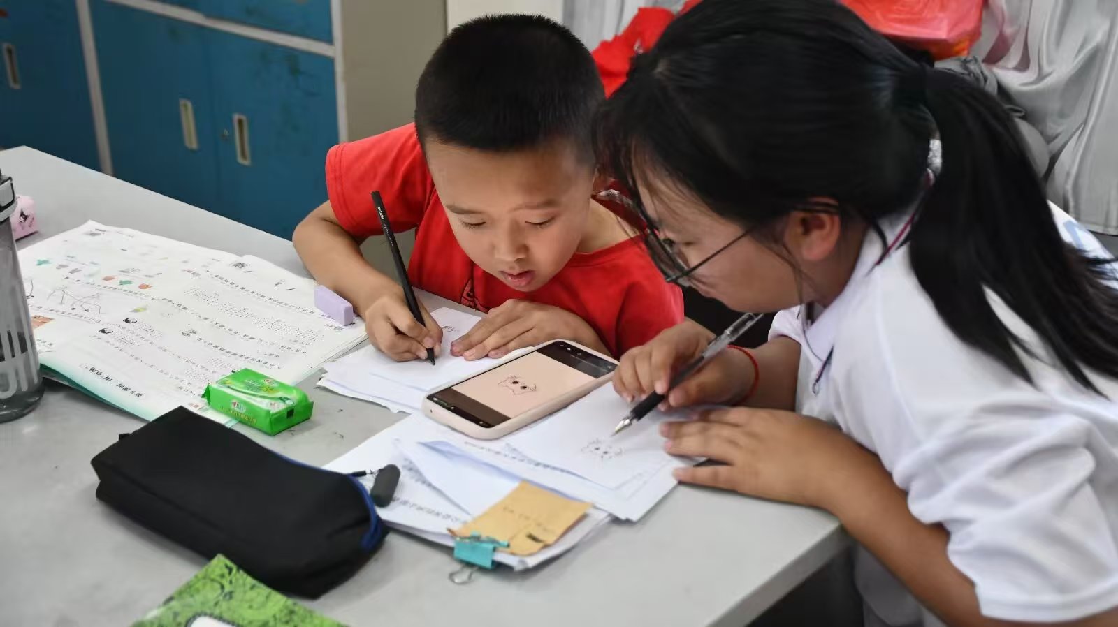 圖為實踐團成員與小朋友共同創(chuàng)作小貓簡筆畫。楊謝超 攝