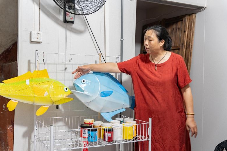 在游覽的過程中,團隊注意到一家掛滿魚燈的店鋪中坐著一位阿姨,她身前的桌上放著魚燈的半成品。經(jīng)詢問得知這位阿姨是魚燈制作技藝傳承人,于是實踐團隊與魚燈傳承人展開訪談。據(jù)傳承人介紹,石浦魚燈可分為“動態(tài)魚燈”與“靜態(tài)魚燈”兩大類:動態(tài)魚燈下有棍子,常用于大型魚燈舞活動,其需通過竹篾定型、棉布裱糊、LED燈帶嵌入等工序,實現(xiàn)“游動發(fā)光”效果,側(cè)重實用性;靜態(tài)魚燈則側(cè)重裝飾性與環(huán)保理念。