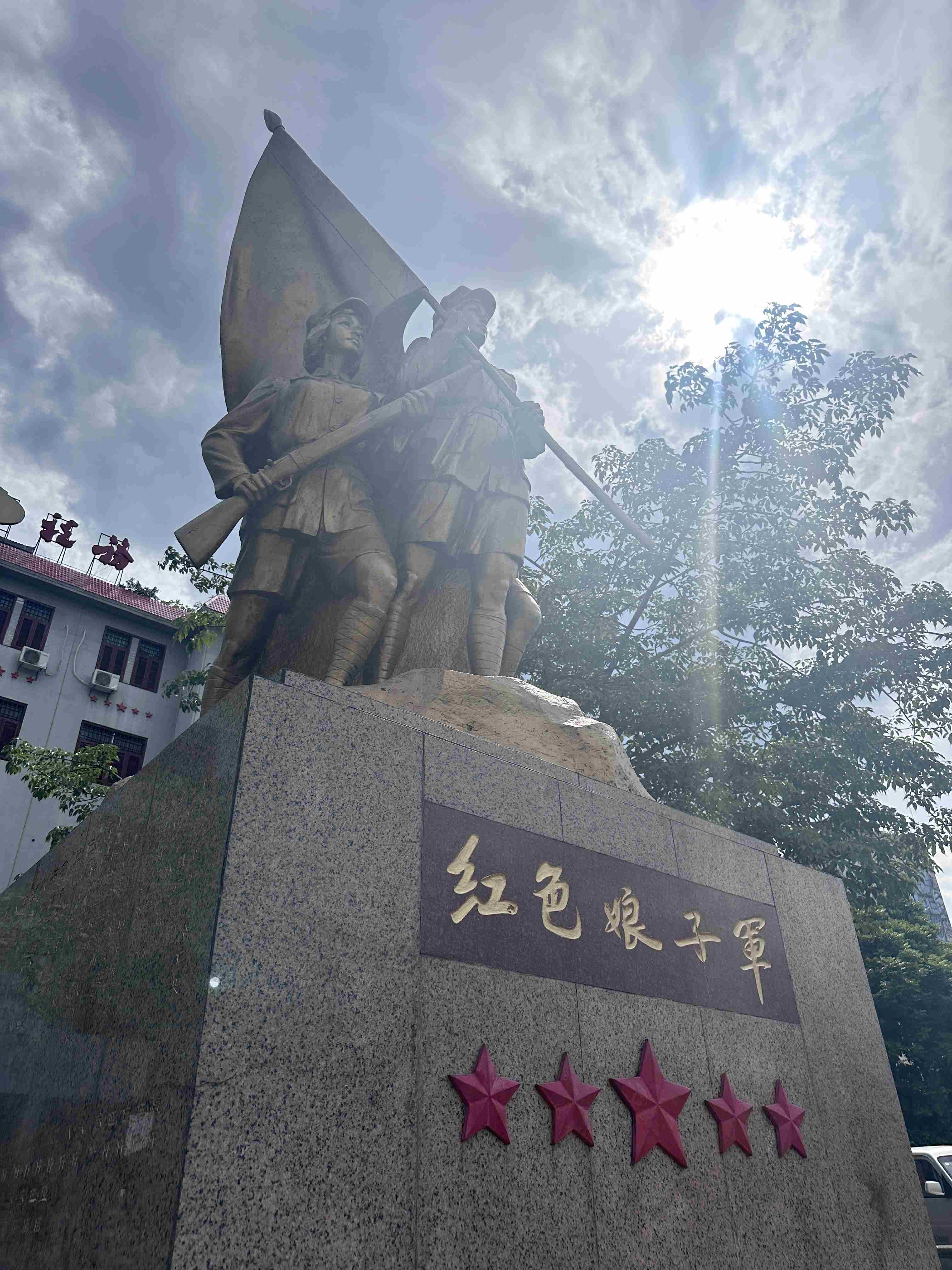 紅妝鐵骨,瓊崖星火 午后的陽光灑滿大地,空氣中彌漫著莊重肅穆的氣息。隊(duì)員們首先來到了不遠(yuǎn)處的陽江鎮(zhèn)紅色娘子軍群像設(shè)立處。三座紅色娘子軍戰(zhàn)士的群像栩栩如生,她們頭戴紅五星八角帽,有的手握軍旗,有的肩挎長槍、身背斗笠,昂首挺胸,目光堅(jiān)毅,展現(xiàn)出巾幗英雄的颯爽英姿。隊(duì)員們通過查閱資料得知:1931年5月1日,中國工農(nóng)紅軍第二獨(dú)立師第三團(tuán)女子軍特務(wù)連就在這里成立,這是中國共產(chǎn)黨領(lǐng)導(dǎo)下第一支成建制的女子軍連隊(duì)。在那個(gè)女性地位低下的年代,這群娘子軍戰(zhàn)士勇敢地沖破封建束縛,拿起武器,投身革命斗爭,參加了50多次大小戰(zhàn)斗,在沙帽嶺伏擊戰(zhàn)、文魁嶺戰(zhàn)斗等戰(zhàn)役中屢建奇功,為瓊崖革命作出了重要貢獻(xiàn)。