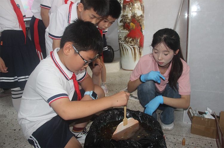非遺漆扇制作 孩子們在志愿者的指導下,體驗傳統(tǒng)漆扇制作工藝。通過調(diào)配顏料、滴染和轉印,每位孩子都創(chuàng)作出了獨一無二的漆扇作品,感受中華傳統(tǒng)文化的魅力。
