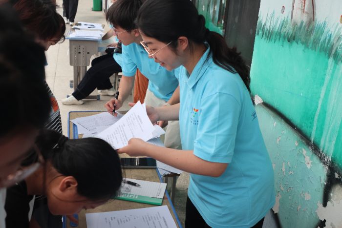 圖為支教團(tuán)成員協(xié)助現(xiàn)場報(bào)名