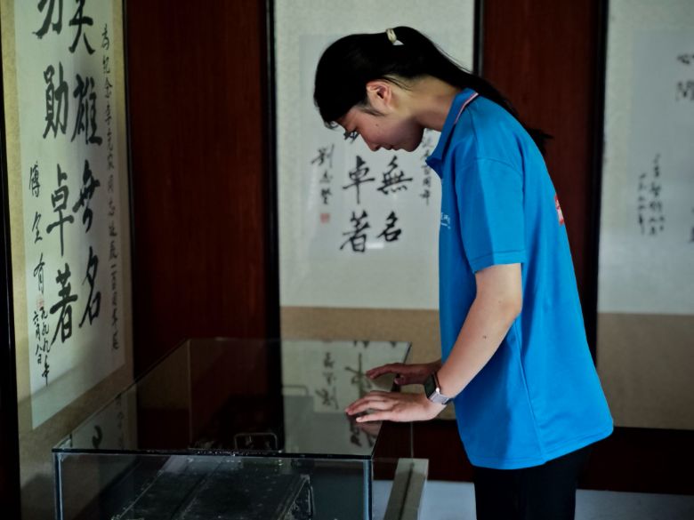 實踐團成員依次參觀李克農(nóng)將軍生平事跡展陳。泛黃的書信、洗舊的衣物、質(zhì)樸的生活器具等珍貴文物,生動再現(xiàn)了李克農(nóng)同志在隱蔽戰(zhàn)線上堅守信仰、克己奉公的光輝歲月。復原的書房內(nèi),一張斑駁的舊書桌與幾把原木椅構(gòu)成全部陳設(shè),展板上"生活上向低標準看齊,工作上向高標準要求"的箴言,恰如其分地詮釋了將軍嚴于律己的人生準則,令在場師生深受觸動。