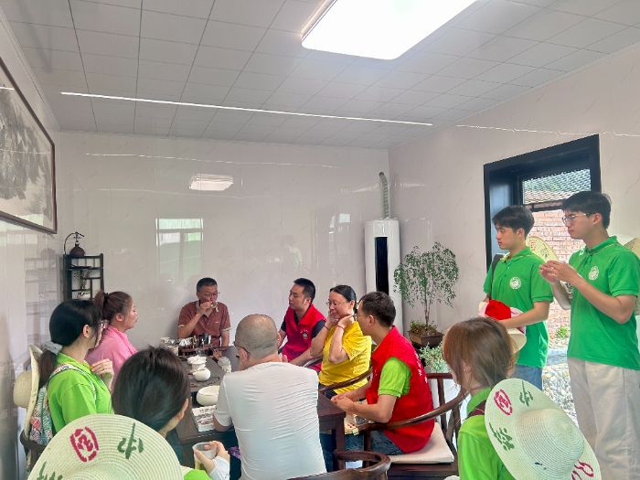 在輕松愉快的氛圍中,實(shí)踐隊(duì)與帶隊(duì)老師、基地負(fù)責(zé)人圍坐品茗,手捧清香的茯苓茶,就茯苓產(chǎn)業(yè)的種植技術(shù)、市場(chǎng)前景及產(chǎn)業(yè)升級(jí)展開了深入交流。這種寓交流于品茗的互動(dòng)形式,不僅讓討論更加生動(dòng)活潑,也讓隊(duì)員們對(duì)茯苓產(chǎn)業(yè)有了更直觀立體的認(rèn)識(shí)。