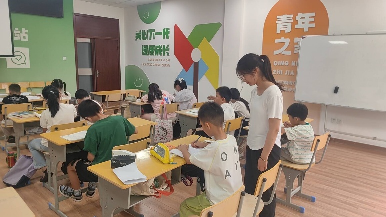 上午9點(diǎn),暑托班的第一個環(huán)節(jié)——學(xué)業(yè)輔導(dǎo)正式開始。孩子們紛紛拿出暑假作業(yè),志愿者們迅速分散到各個小組,耐心解答疑問。