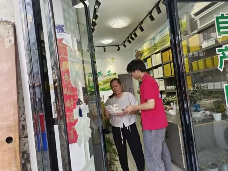 7月6日,宣傳團來到鳳凰山街道草城街社區(qū)。正值早市尾聲,菜市場旁的商鋪剛卸下卷簾門,騎著三輪車的居民、搬貨的店主往來穿梭,社區(qū)內十分繁忙。成員們分成兩列,沿著青石板路向沿街商戶遞發(fā)宣傳冊,遇到駐足翻看的居民便主動上前講解。一家雜貨店的老板接過問卷,邊填邊指著對面的早餐店說:“我身邊有朋友獻過血,感覺也沒什么不好的,你們這個宣傳活動挺好的,能讓更多人了解獻血的知識。你看隔壁老李,上次住院用血還免了不少費用呢。”