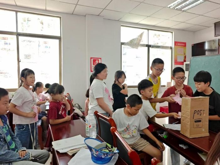 在“我的祖國(guó)我奉獻(xiàn)”活動(dòng)中,《每一個(gè)你》的歌聲里,實(shí)踐團(tuán)成員分享中國(guó)志愿者的故事,孩子們聽(tīng)得專注,隨后伏案寫(xiě)下心中對(duì)“奉獻(xiàn)”的理解,又手繪祝?ㄆ,把純粹的善意悄悄傳遞給中國(guó)志愿者。“薪火傳九州,同拼中國(guó)夢(mèng)”環(huán)節(jié)孩子們積極參與,課堂氛圍持續(xù)活躍。省份接龍時(shí),孩子們爭(zhēng)相搶答,用童趣的聯(lián)想記住一個(gè)個(gè)地名。鋪開(kāi)中國(guó)地圖拼圖,大家圍攏協(xié)作,小心比對(duì)每一塊拼圖的位置,當(dāng)完整的版圖在眼前展開(kāi),稚嫩的驚嘆聲里滿是對(duì)祖國(guó)疆域的好奇與熱愛(ài)。同時(shí),“知心姐姐的魔法信箱”靜靜立在角落,悄悄收納著孩子們的小煩惱,又遞出帶著暖意的回信。