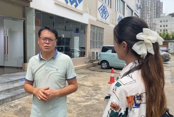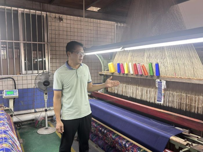 圖為周廠長(zhǎng)介紹壯錦的原材料來源。韋可明攝