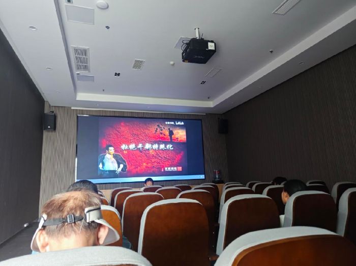 圖為實(shí)踐團(tuán)成員在在展廳觀影照片