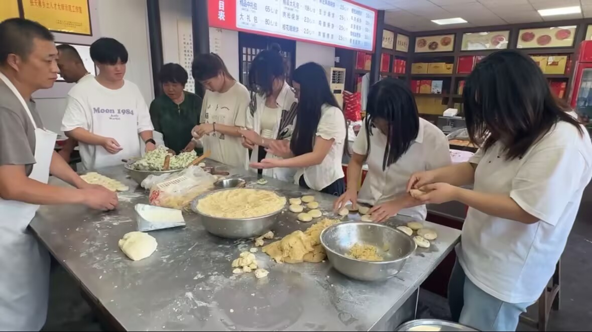 圖為團隊成員在當?shù)貙W做黃橋燒餅圖 周歆妍供圖