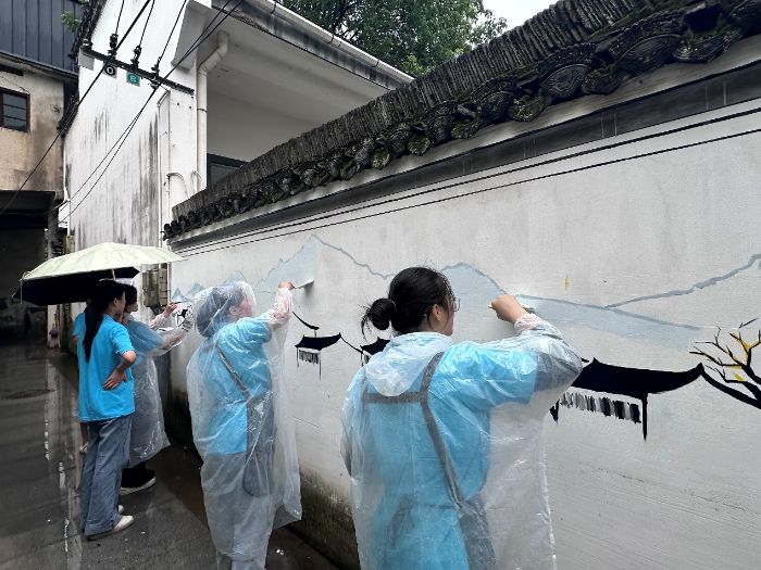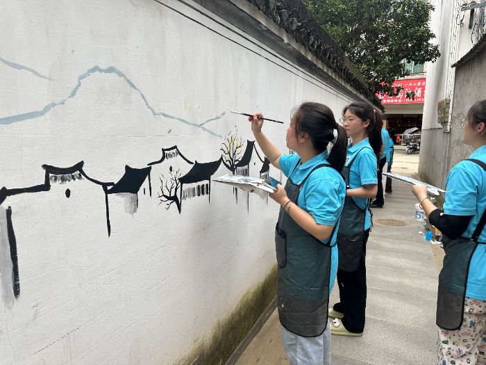 午后,盡管天降雨露,實踐團仍冒雨啟動墻繪活動。成員們分工協作,以灰白墻面為天然畫布,巧妙融入山水輪廓、徽派民居等地域元素,用流暢線條,將鄉(xiāng)村自然風光、人文底蘊轉化為生動藝術圖景。