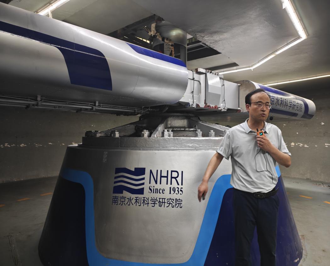 7月2日下午,實踐團前往南京水利科學研究院,重點參觀通航試驗廳與土工離心機試驗廳。在通航試驗廳,1:100比例的三峽大壩模型生動展示了泄洪效能優(yōu)化與霧化影響研究,其不對稱泄洪孔設計為污水處理廠曝氣系統(tǒng)優(yōu)化提供了技術參考;水利驅動式垂直升船機模型所蘊含的流體控制原理,為污水處理沉淀池設計帶來新啟發(fā)。