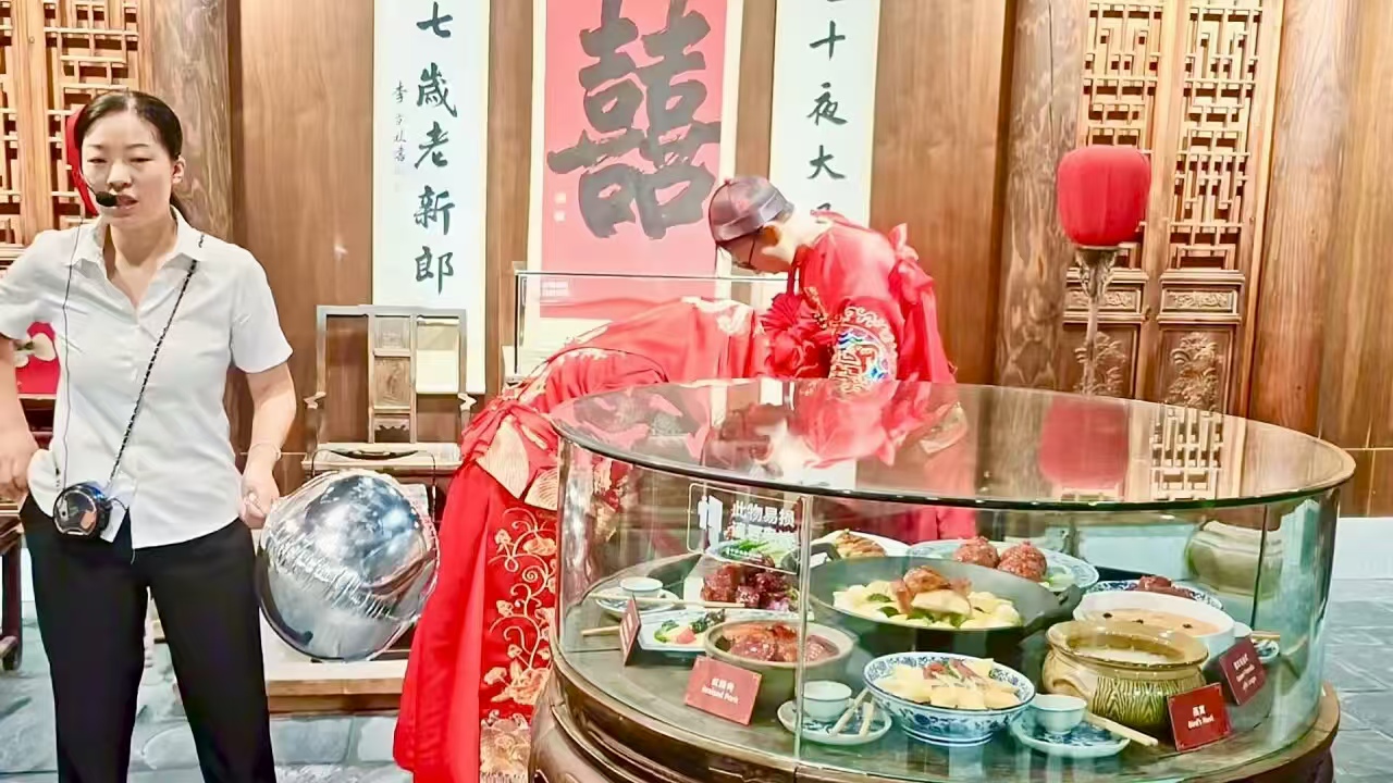 徽州古城魚燈表演 汪彥 攝 品味徽菜,領(lǐng)悟文化韻味 實(shí)踐團(tuán)先后赴徽州糕餅博物館與徽菜博物館開展飲食文化考察。在糕餅博物館,團(tuán)隊(duì)系統(tǒng)學(xué)習(xí)徽州糕餅發(fā)展脈絡(luò),通過現(xiàn)代工藝與古法技術(shù)融合的展陳,理解了傳統(tǒng)食品產(chǎn)業(yè)化路徑;于徽菜博物館,實(shí)踐團(tuán)成員沉浸式研究清末民初徽州茶館文化形態(tài),重點(diǎn)考察了非遺飲食展區(qū),其中徽州豆干的制作技藝及臭鱖魚發(fā)酵工藝特征成為實(shí)踐團(tuán)成員重點(diǎn)調(diào)研對(duì)象。此次考察深化了實(shí)踐團(tuán)成員對(duì)徽州飲食文化保護(hù)與創(chuàng)新實(shí)踐的認(rèn)識(shí)。