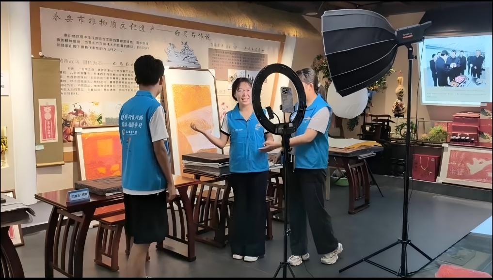 最讓人驚喜的,是村文化活動室里的非遺拓片體驗。“先把宣紙鋪平整,鬃刷要輕輕打,力道勻了才能顯出紋樣……”當(dāng)?shù)胤沁z傳承人耐心地示范著,同學(xué)們圍在桌前,屏氣凝神地模仿。為了更好地傳承這項非物質(zhì)文化遺產(chǎn),本團隊將“指尖上的傳承”通過直播鏡頭傳到了千里之外,吸引了超過千名師生在線觀看。隊員張永志舉著手機調(diào)整角度,笑著說:“沒想到咱們在村里玩拓片,能讓這么多人看見白馬石村的美!”