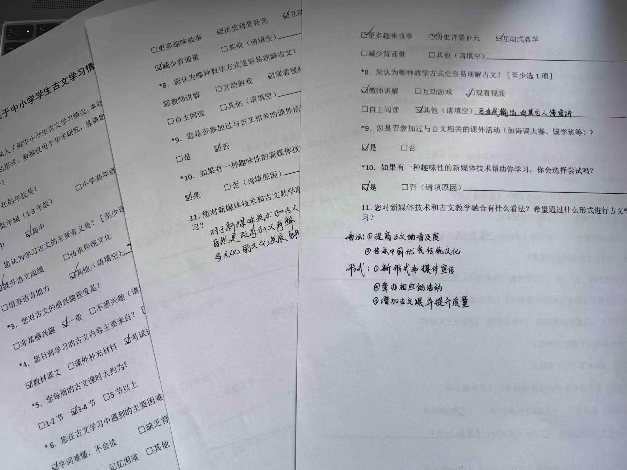 截至7月27日,團隊累計走訪泰和縣3所學(xué)校,2個社區(qū),收集有效問卷155份,并計劃形成調(diào)研報告。團隊指導(dǎo)老師、廣西師范大學(xué)文學(xué)院教授肖瑜表示,此次調(diào)研報告將聚焦“情境化教學(xué)”和“跨學(xué)科融合”兩大方向,“讓古文從試卷走向生活,才是傳承的根本”,肖瑜說。