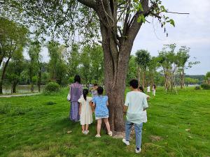 抵達(dá)大運(yùn)河風(fēng)光帶時(shí)已近黃昏。孩子們?cè)诖筮\(yùn)河邊奔跑、嬉戲,志愿者趁機(jī)開展自然教育,教他們辨認(rèn)植物、觀察昆蟲。孩子們興奮地收集樹葉和石子,制作成紀(jì)念品送給志愿者。