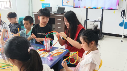 另一邊,9歲的阿澤專注搭建花籃,將吸管彎折、穿插,認(rèn)真調(diào)整每一根的角度。“老師,花籃能裝小花嗎?”他舉著半成品詢問。隊員點頭鼓勵,“當(dāng)然!你的花籃可以裝滿創(chuàng)意小花”。阿澤眼睛一亮,用彩紙剪出花朵裝飾,完成后興奮地展示:“這是送給社區(qū)花園的禮物!”孩子們用吸管拼搭出圓球、花籃,還有造型各異的小動物,在互動交流里,把普通材料玩出無限可能。