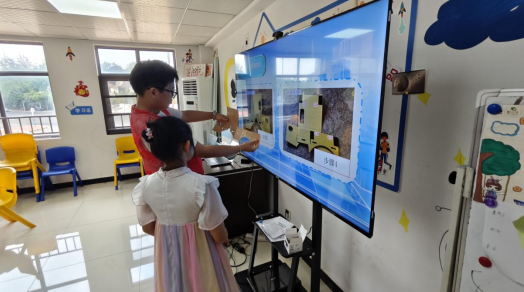 圖為志愿者認(rèn)真比對(duì)屏幕教程,協(xié)助小朋友制作VR眼鏡。周明杰攝