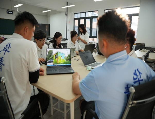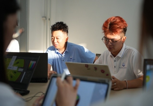 王華梓老師則從藝術(shù)表現(xiàn)手法上提出具體指導:“色彩要貼近自然,用嫩綠表現(xiàn)新葉、深褐勾勒果毛,再以暖黃點綴陽光,讓整體畫面充滿生機。同時,線條需兼具靈動與質(zhì)樸,避免過度裝飾,才能與鄉(xiāng)村墻面的肌理相協(xié)調(diào)。”針對學生團隊初步提交的三版設(shè)計草圖,兩位老師逐一點評,重點討論了畫面構(gòu)圖的主次關(guān)系、元素比例的合理性,以及如何通過墻繪傳遞“鄉(xiāng)村振興”的積極理念。