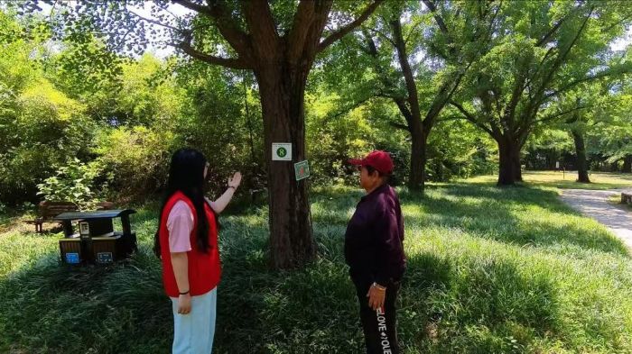 銀杏古園行,共建生態(tài)之美“為了您,這座古銀杏群已等了千年。”實(shí)踐團(tuán)成員們懷揣著對(duì)自然的敬畏之心踏入泰興古銀杏公園,開(kāi)展生態(tài)辨識(shí)研學(xué)活動(dòng)。1.1萬(wàn)株百年銀杏與兩株千年古樹(shù)傲然挺立,虬枝舒展間,見(jiàn)證著歲月的更迭。團(tuán)隊(duì)成員們穿梭于銀杏林深處,利用數(shù)字軟件“花伴侶”開(kāi)展生態(tài)辨識(shí)。同時(shí),團(tuán)隊(duì)成員邀請(qǐng)游客們一同參與生態(tài)探索,俯身細(xì)察扇形葉片的精致脈絡(luò),認(rèn)真記錄數(shù)據(jù),探尋“植物活化石”歷經(jīng)時(shí)代更迭而不朽的生存智慧。從銀杏的葉片到林間其他花草的生長(zhǎng)特性,每一次辨識(shí)都是與自然的一次深度對(duì)話,讓保護(hù)自然的種子在每個(gè)人心中悄然生根,為古銀杏公園增添了一抹溫暖的人文綠意。