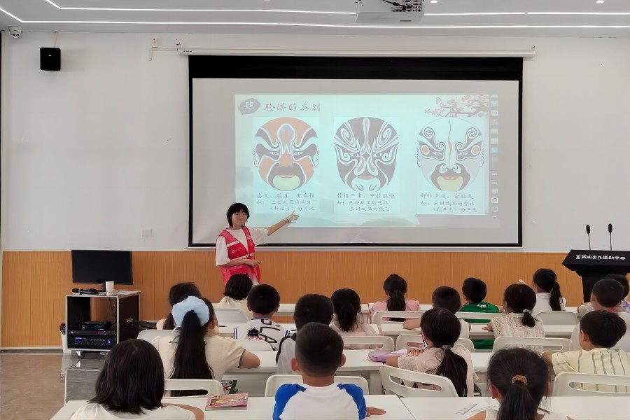 坐在后排的小男孩突然舉手:“老師,我爺爺唱山歌時臉上也畫過這樣的道道!”一句話打開了孩子們的話匣子,大家紛紛分享起見過的臉譜元素——廟會上的面具、年畫里的花臉,原本存在于書本中的非遺文化,就這樣變成了孩子們身邊熟悉的記憶碎片。