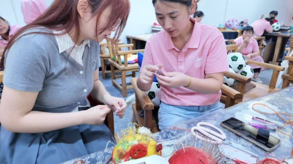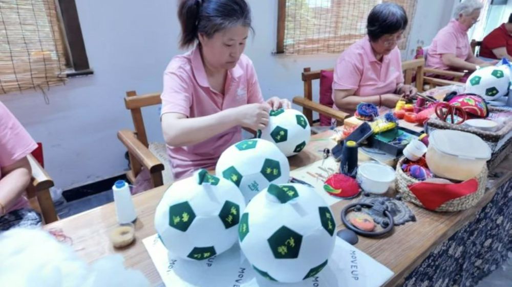 在香包工坊里的另一處內(nèi)幾位師傅正圍坐在一起,手中縫制的不是綢緞香囊,而是黑白相間的足球。這是馬莊工坊開發(fā)的“蘇超”足球香包項目。從香包的“小而美”到足球的“大而實”,不變的是對“針腳牢固、形態(tài)周正”的追求。王秀英老人表示:“手藝不能只躺在過去里,得跟著時代走。”如今,香包不僅有了車載掛件、文創(chuàng)禮盒等新形態(tài),針線活又走進了足球制作,傳統(tǒng)技藝正在以一種新的方式“活”起來。隊員們表示,返回家鄉(xiāng)參與實踐的過程中,更重要的是學習到了這種創(chuàng)新精神,他們希望能將其運用到實際中,為家鄉(xiāng)的文化傳承與發(fā)展注入新的活力。