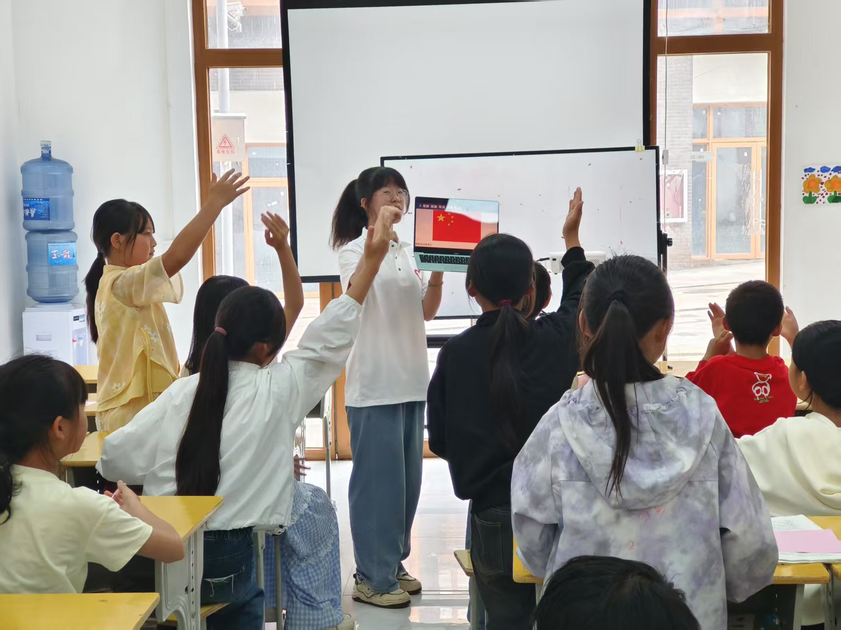 林老師還將制作旗幟的材料發(fā)給同學(xué)們,孩子們兩兩成組,在紅色的長(zhǎng)方形紙上貼上一個(gè)個(gè)小星星,制作出一面面動(dòng)人美麗的小國(guó)旗,“老師,我做得好嗎?”“老師,我們倆也做好啦”孩子們稚嫩的小手小心翼翼地將黃星對(duì)齊邊角,有的歪著頭比對(duì)位置,有的互相幫忙按住紙張。“我的星星貼得最正!” 一個(gè)扎羊角辮的小姑娘舉著作品歡呼,旁邊的小男孩趕緊舉起自己的,“你看我的也不差!” 教室里滿是歡聲笑語,紅色的紙片在陽(yáng)光下晃出溫暖的光,映著孩子們亮晶晶的眼睛。